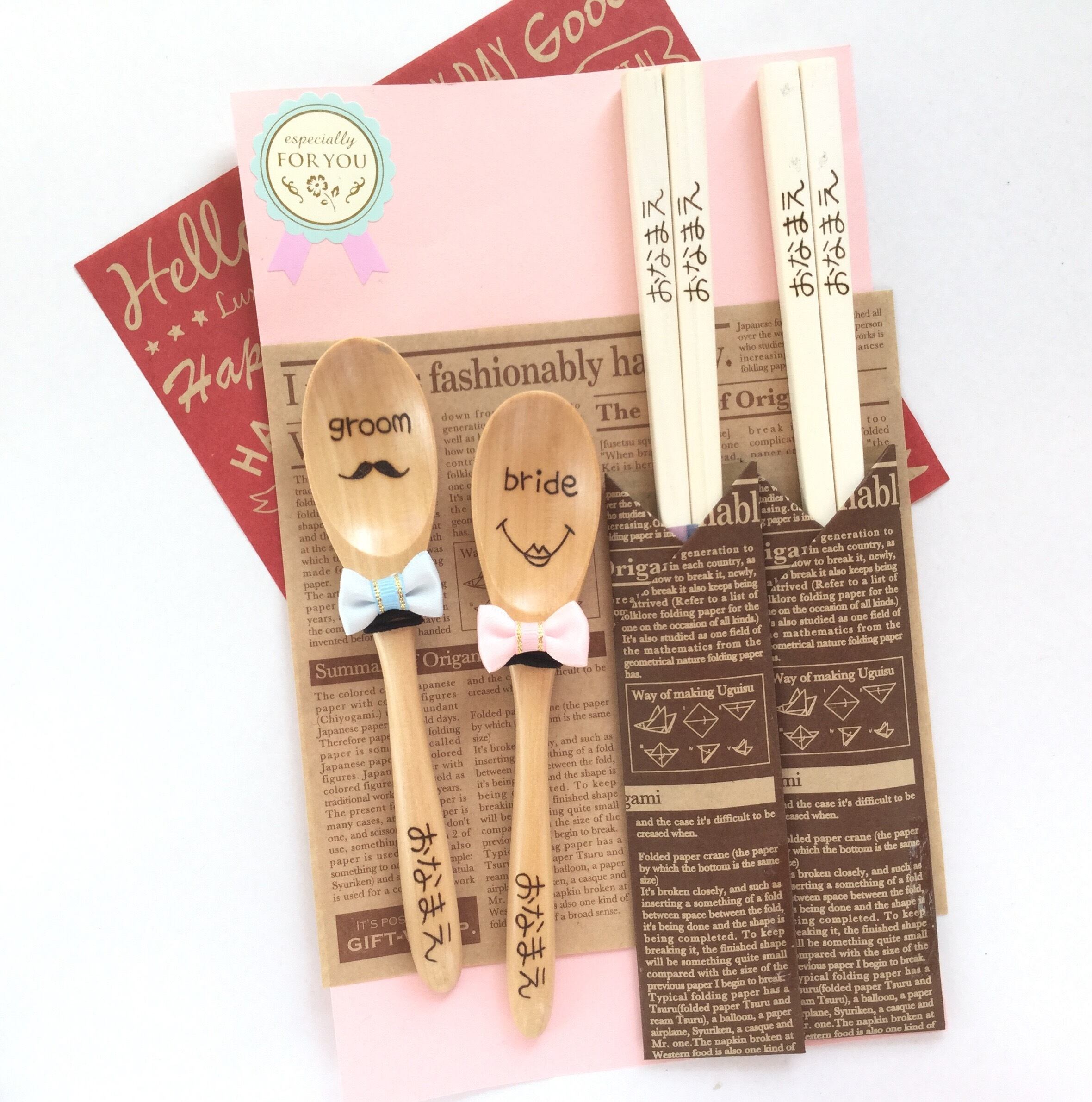 ウエディング(新郎新婦)用白い夫婦用のお箸と木製スプーン2本セット